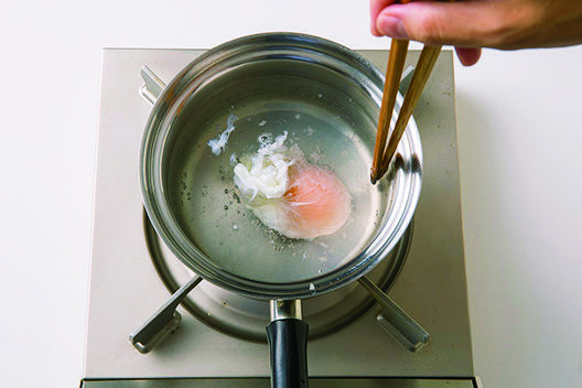 3.別の小鍋に湯(分量外)を沸かし、酢少量(分量外)を入れて菜箸で円を描くように混ぜ、卵1個を中心に落として3分ほどゆでて冷水に取る(ポーチドエッグ)。残りも同様にする。