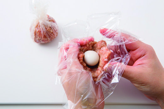 ラップに肉だねの1/6量を広げてうずら卵1個を押し込み、包むようにして丸めます。