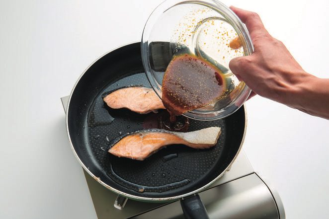 今回は「サーモンの照り焼き 香るみそ風味」を紹介。脂ののったサーモンは、みそと好相性。香りがとばないよう、焼き上がる直前にたれを加えます。