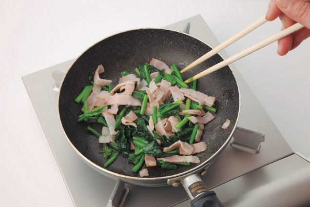 ベーコンとほうれん草をオリーブ油で炒め、ベーコンのうまみをほうれん草に移しておく。