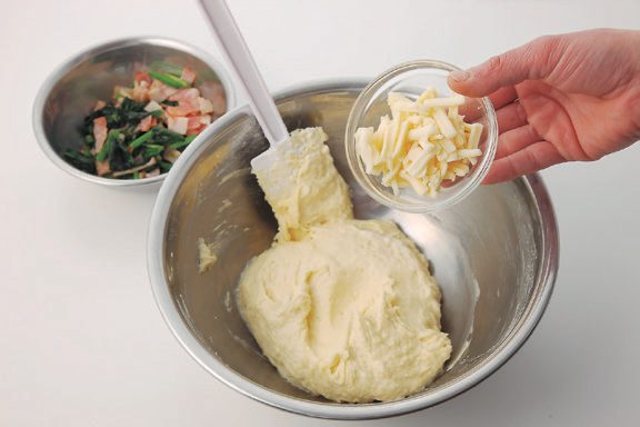 2.1にベーコンとほうれん草、チーズを加えて混ぜ、型に入れて180度のオーブンで25~30分焼く。