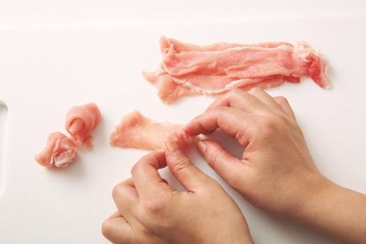 火の通りやすい薄切り肉を丸めて団子にするのがポイント。豚肉は1枚ずつ広げ、くるくると巻いてボール状にする。