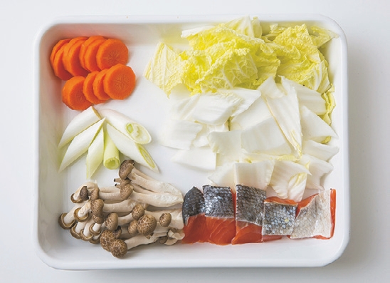 さけは食べやすい大きさに切る。白菜はざく切り、長ねぎは3~4cm長さの斜め切りにする。にんじんは7~ 8mm厚さの輪切りにし、大きければさらに半分に切る。しめじは石づきを取って小房に分ける。