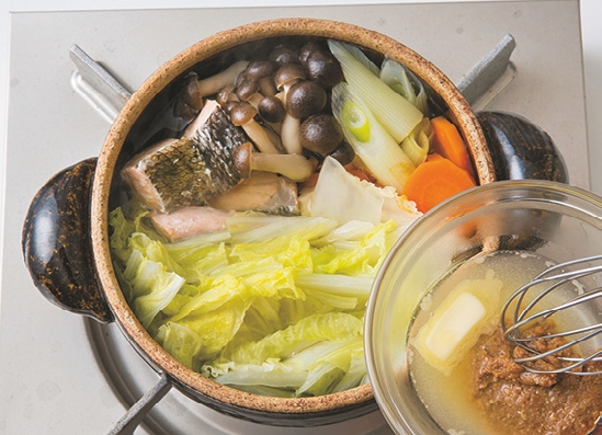 そこで今回は、さけとともに白菜や長ねぎ、にんじんなどの野菜がたっぷりとれる「石狩鍋」を紹介。最後にみそとバターを加えることでコクを出します。