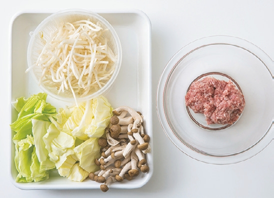 もやしはできればひげ根を取る。しめじは石づきを取って小房に分け、キャベツはざく切りにする。【A】をよく練り混ぜて肉だねを作る。