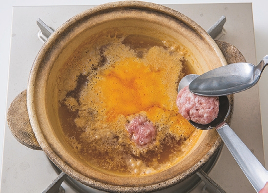 鍋に【B】を入れてよく混ぜ、水を少しずつ加えて混ぜ溶かす。火にかけ、煮立ったら、肉だねをスプーン2本で軽く丸めて加える。