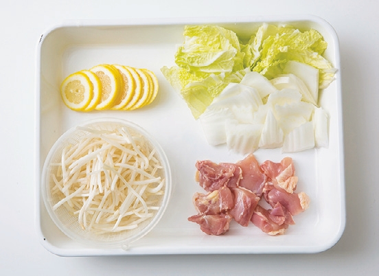 鶏肉は一口大に切る。レモンは5mm厚さの輪切り、白菜はざく切りにする。もやしはできればひげ根を取る。