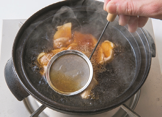 鍋に【A】を入れて煮立て、鶏肉を加え、アクが出たら取る。