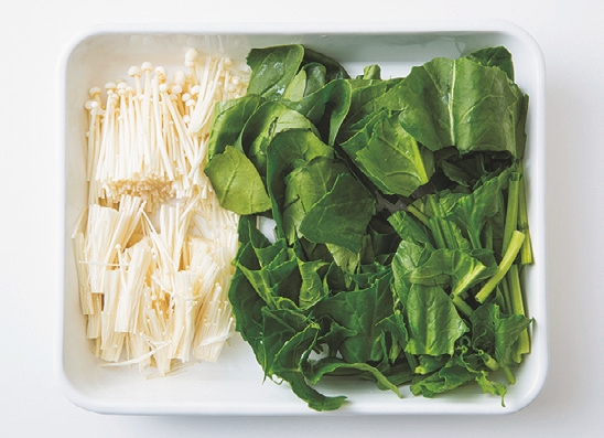 ほうれん草は根元を切り落としてざく切りにし、えのきだけは根元を切り落として長さを半分に切る。
