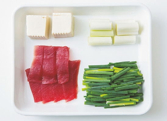 長ねぎは3~4cm長さに切り、万能ねぎは4~5cm長さのざく切りにする。豆腐は半分に切り、まぐろは食べやすく切る。