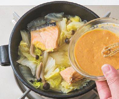 みそと酒粕は鍋の煮汁であらかじめ溶いてから加えると、鍋全体に味がゆき渡りやすくなる。