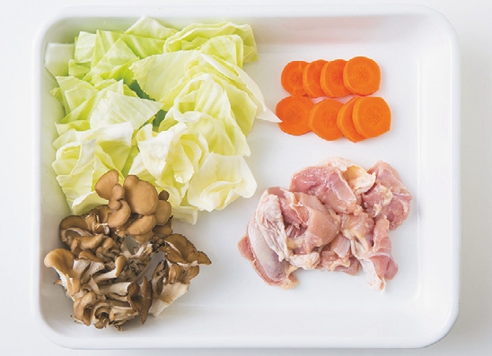 鶏肉は一口大に切る。キャベツはざく切り、にんじんは5mm厚さの輪切りにする。まいたけは小房に分ける。