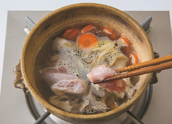 鍋に【A】とまいたけ、にんじんを入れ、火にかける。煮立ったら鶏肉を加え、アクが出たら取る。