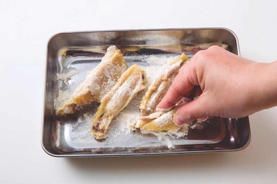 1に薄力粉をまぶし、サラダ油を熱したフライパンに並べて中火でさっと焼く。
