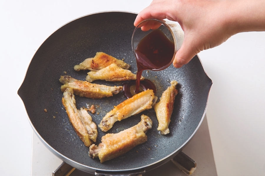よく混ぜた【B】を加え、肉の上下を返しながらからめ、照りが出るまで焼く。器に盛り、あればクレソンを添える。