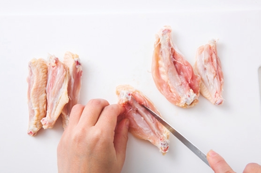 ▲【準備】手羽中は骨に沿って包丁で切り込みを入れる。