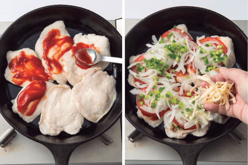 フライパンにサラダ油を熱して鶏肉を並べ、片面が焼けたら返して火を止め、鶏肉の表面にケチャップを塗る。トマトを1枚ずつのせて玉ねぎを均等にのせ、万能ねぎ、チーズを散らす。