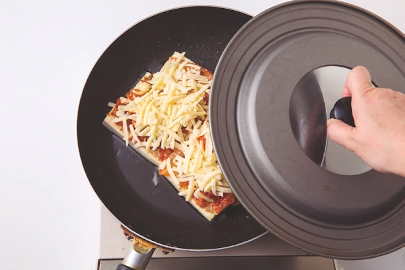 市販のごまだれをスプーンで塗り広げ、キムチ、チーズをのせてふたをします。チーズが溶ければ完成。