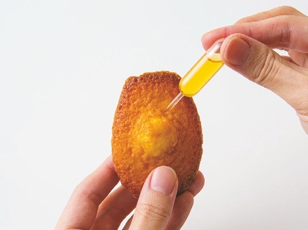 製菓用ピペットにはちみつを入れ、食べる前にマドレーヌに刺し、はちみつを注入する。