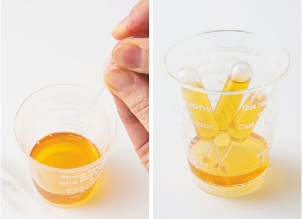 はちみつをピペットに入れるときは、ピペットの空気を充分に抜き、はちみつを入れた器に入れて放っておく。こうすると、自然にピペットにはちみつが吸われる。