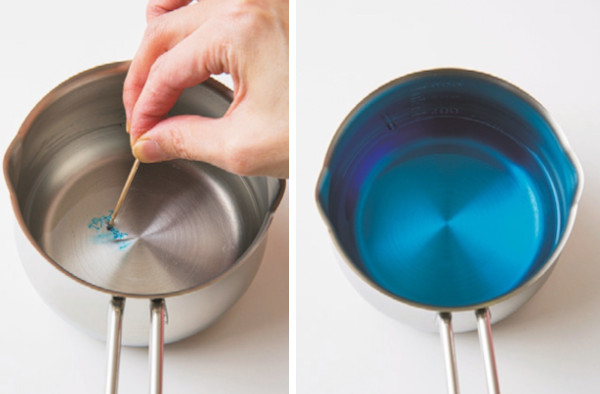 1~2の要領で青のゼリーを作り、4に流して冷やし固め、4の要領で白のゼリーを流して冷やし固める。