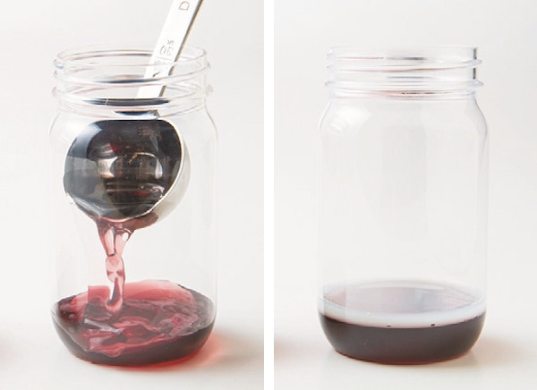 容器に流すときは、できるだけ側面につかないようにスプーンなどで注ぐ。側面についたら、キッチンペーパーなどでふき取る。カラーゼリーの間に白のゼリーを注いで白の層を作ると、カラーゼリーの色が際立つ。