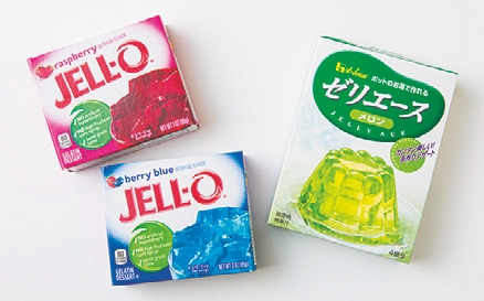 カラーゼリーは、市販のゼリーの素を使ってもOK。フルーツゼリーの素を使うと、フルーツの味がする。水の代わりにフルーツジュースを使っても。色はカラージェルで調整する。
