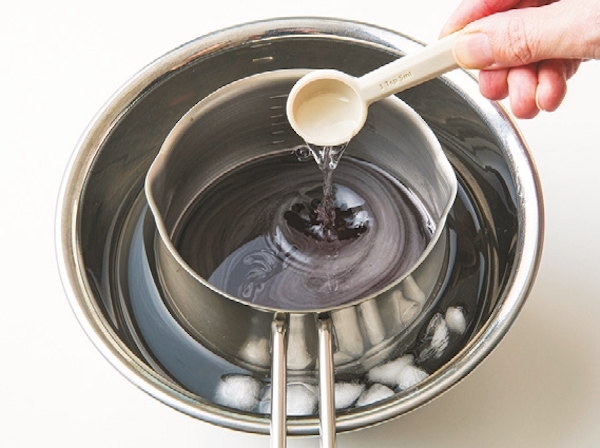 ▲ゼリー液にキルシュを加えると、ゼラチン臭がやわらぐ。アルコールが苦手であれば、レモン果汁を加えても。