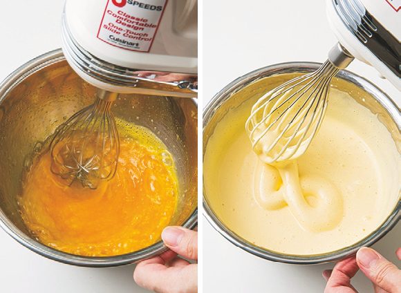 湯せんから外し、ハンドミキサーで泡立てる。白っぽくもこもこしてきて、「8」の字がかけるくらいまでしっかり泡立てる。