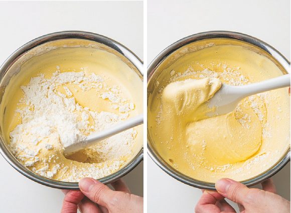 薄力粉を加え、ゴムべらで底からすくい上げるようにして粉気がなくなるまで混ぜる。