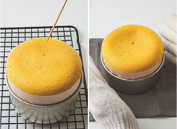 中心に竹串を刺し、生地がついてこなければ焼き上がり。ぬれ布巾に型ごと3回ほどやさしく打ちつけて型から出し、ペーパーごと網にのせて冷ます。