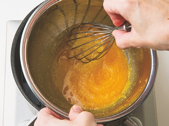 ボウルに卵、グラニュー糖、水あめを入れ、ボウルの底を湯せんにあてながらハンドミキサーの羽根または泡立て器でよく混ぜ、40℃くらいまで温める。