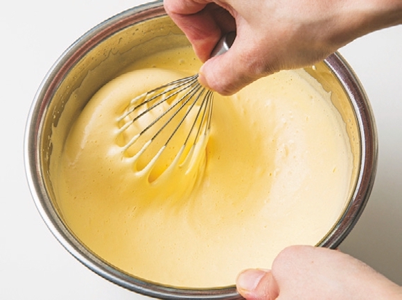 今回は、お菓子でよく使う「スポンジ生地」のレシピを紹介します。卵黄と卵白をいっしょに泡立て、口溶けのよい食感に仕上げます。