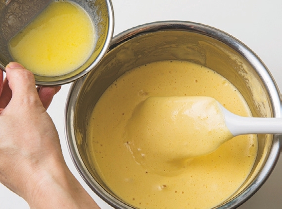 牛乳と合わせて溶かしたバターを加え、ゴムべらで底からすくい上げるように混ぜる。気泡をつぶさないように注意する。