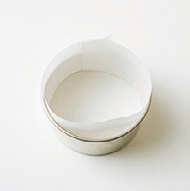 ・型の底と側面にオーブンペーパーを敷く。底は直径に合わせ、側面は型の縁より2cm高くする。 ※写真下