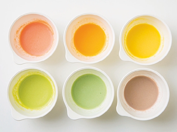 生地はピンク、オレンジ、黄、緑、青、紫の6色に。焼くと色が少しあせるので、焼き上がりよりも鮮やかにする。