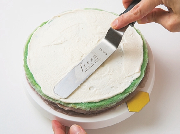 ホイップクリームはスパテラでクレープの縁まで均一に塗り広げると、重ねたときに美しく仕上がる。