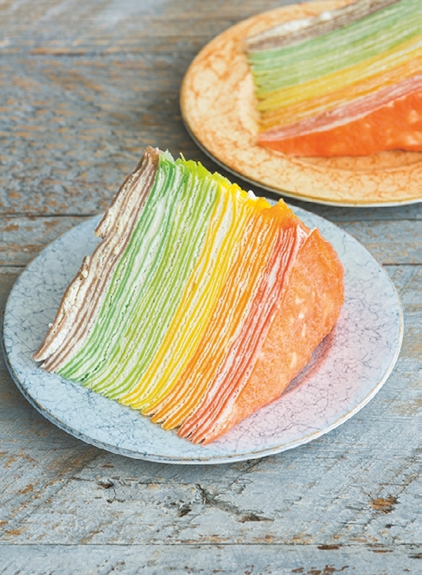 今回は、クレープ生地をレインボーカラーに仕上げた「レインボーミルクレープ」を紹介します。6色の色目を抑えて、大人シックに仕上げるのがポイントです。
