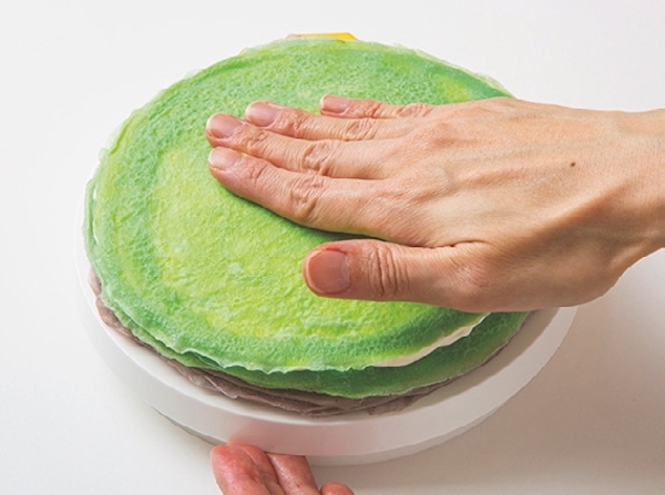 中心が高くなりやすいので、重ねたら手で軽く押さえ、厚さを均一にする。写真の色順に重ねる。