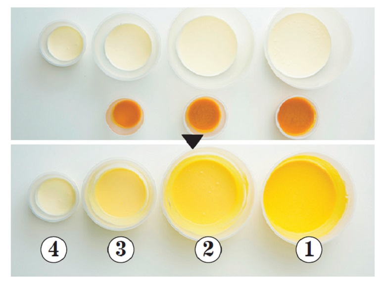マンゴーピューレを[1]のボウルに120g、[2]のボウルに35g、[3]のボウルに10g加え、それぞれよく混ぜる。[4]にはピューレは混ぜない。カラージェルを楊枝でほんの少し取ってそれぞれに加えて混ぜ、4つの生地を作る。
