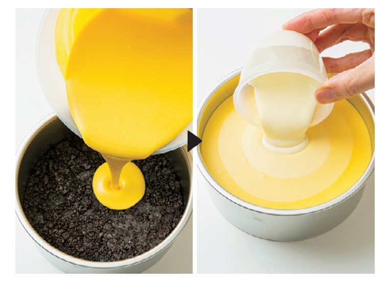 型の中央に、色の濃い順にチーズケーキ生地をゆっくりと流す。自然と広がりグラデーションが作られる。
