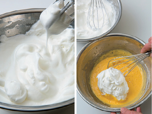 別のボウルにメレンゲの材料を入れ、ハンドミキサーで角がおじぎをするくらいまで泡立て、1/3量を2に加えて泡立て器で合わせる。残りのメレンゲを2回に分けて加え、そのつどゴムべらでさっくりと合わせる。
