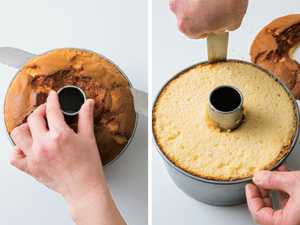 上部のふくらんだ部分をブレッドナイフなどで切り取り、型の周囲に沿ってナイフを入れ、ケーキを取り出して底板をはずす。あれば茶こしで粉砂糖をふる。
