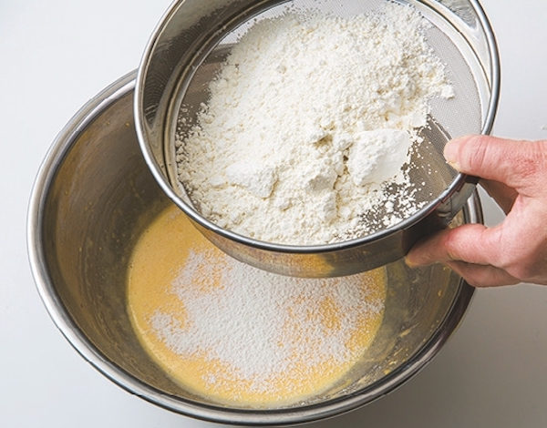 【B】を合わせて1にふるい入れ、泡立て器で合わせる。