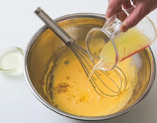 ボウルに【A】を入れて泡立て器で白っぽくなるまですり混ぜ、レモンの皮、レモン果汁、サラダ油を加えてよく混ぜる。