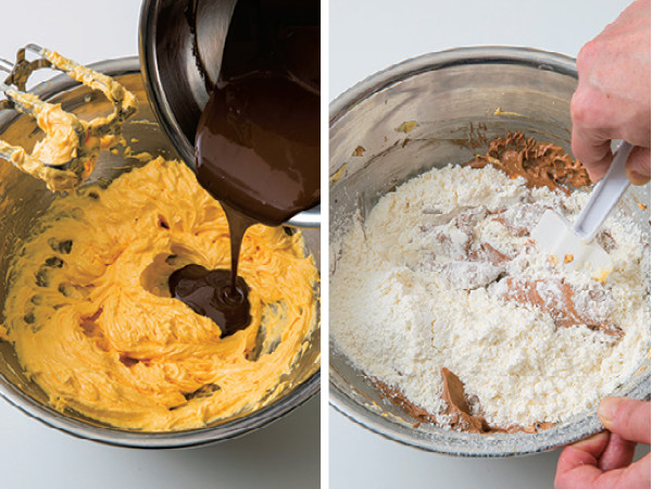 1に溶かしたチョコレートを加えてよく混ぜる。合わせた【A】をふるい入れ、ゴムべらで切るように合わせる。