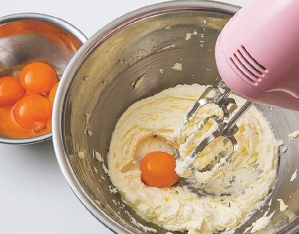 ボウルにバターと上白糖を入れてハンドミキサーですり混ぜ、白っぽくなったら卵黄を1個ずつ加え、そのつどよく混ぜる。