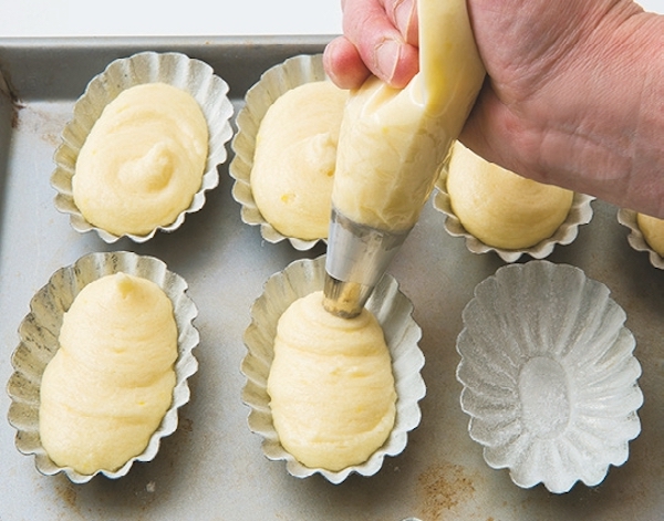 天板に型を並べ、3を丸口金をつけた絞り袋に入れて型の八分目まで絞り入れる。