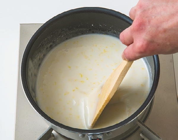 2を鍋に移し、レモンの皮を加える。中火にかけて木べらで絶えず混ぜ、半透明になってつやが出てきたら火からおろす。