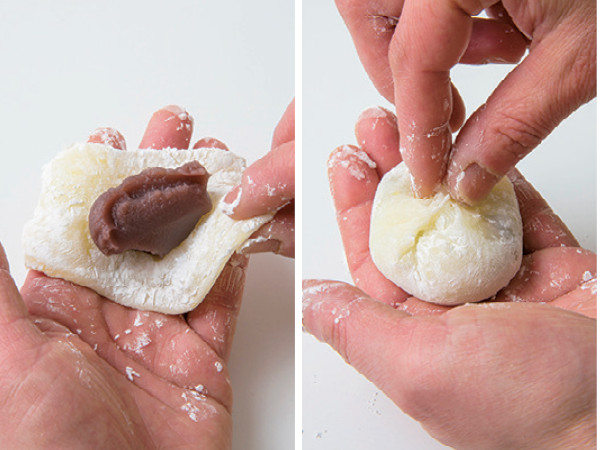 生地の中心を厚めに残し、指で縁のほうを少しのばして広げ、等分にしたこしあんをのせて包む。閉じ目をしっかりとつまんで丸め、余分なコーンスターチをはらう。残りも同様に作る。